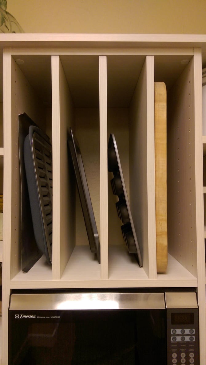 | No space for thin sheet pans in your kitchen? Put them in the pantry with custom shelving. |
