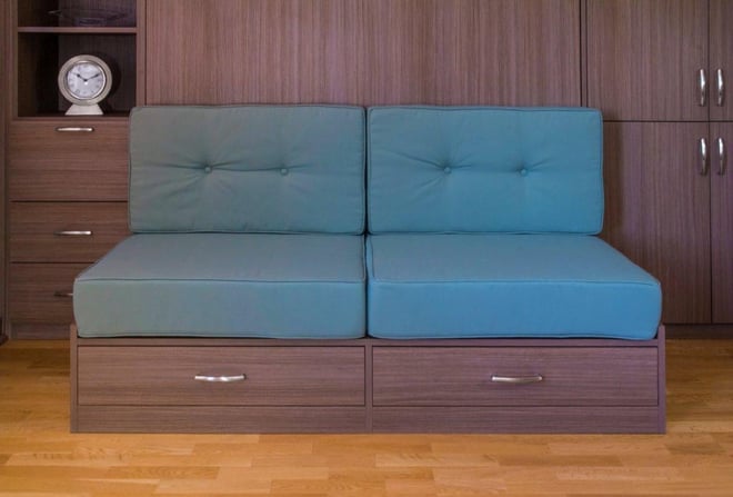 If you’ve downsized to a smaller living area, you may be sleeping on a murphy bed or considering one for your guests. That’s a great start to saving space, but try building even more functionality into your sleeping area. For example, this upholstered blue wall bed, shown below, works as a bed, a bench, and a bureau, all in one easily-accessible location. Also, note how the bed storage connects with the integrated wall cabinetry. This piece is the perfect example of approaching a tiny house as a “living unit” instead of a standard house with furniture.