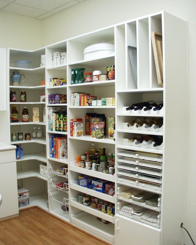 - Lids and containers. Many of us have “disaster” cabinets full of a jumble of mismatched lids and containers. Incorporate storage space for containers into your pantry and never waste time searching for the proper size and the right lid again.